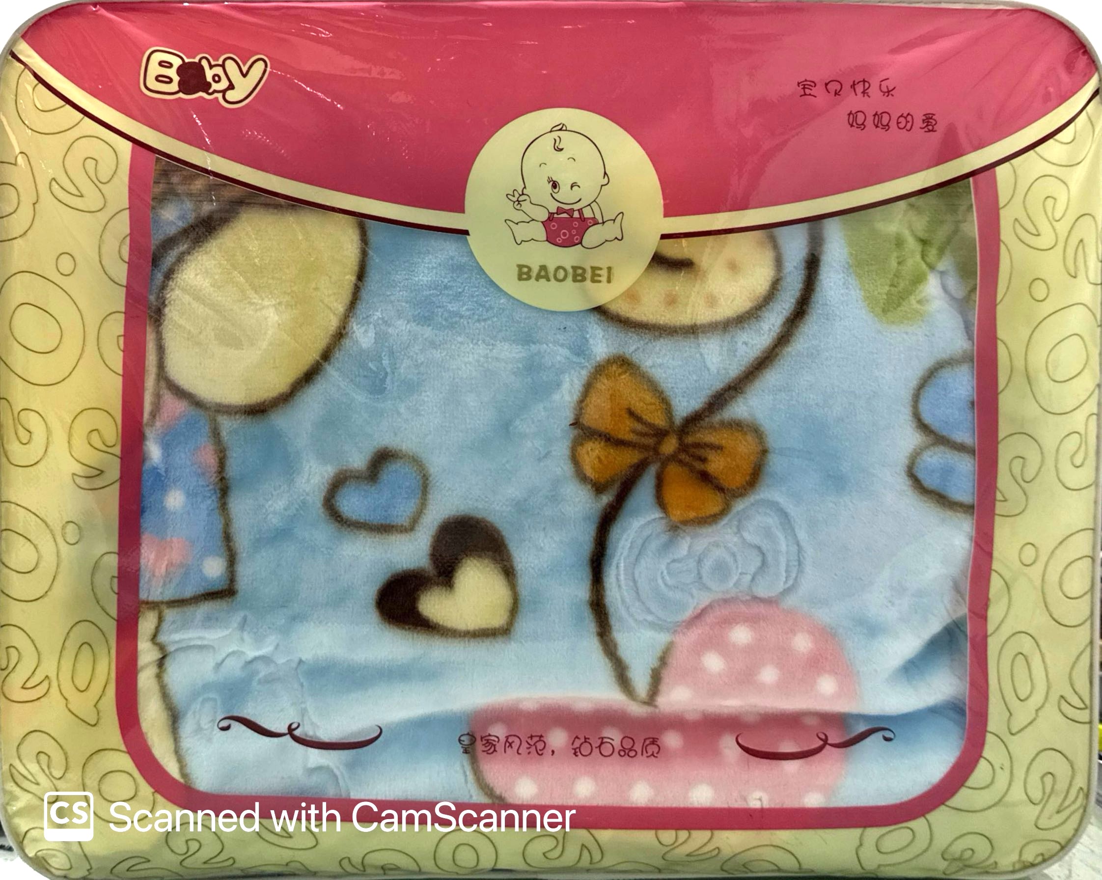 The product in the image is a Baobei “High Chass” infant blanket. The packaging also features Chinese text that translates to “Royal style, diamond quality” (皇家风范, 钻石品质).